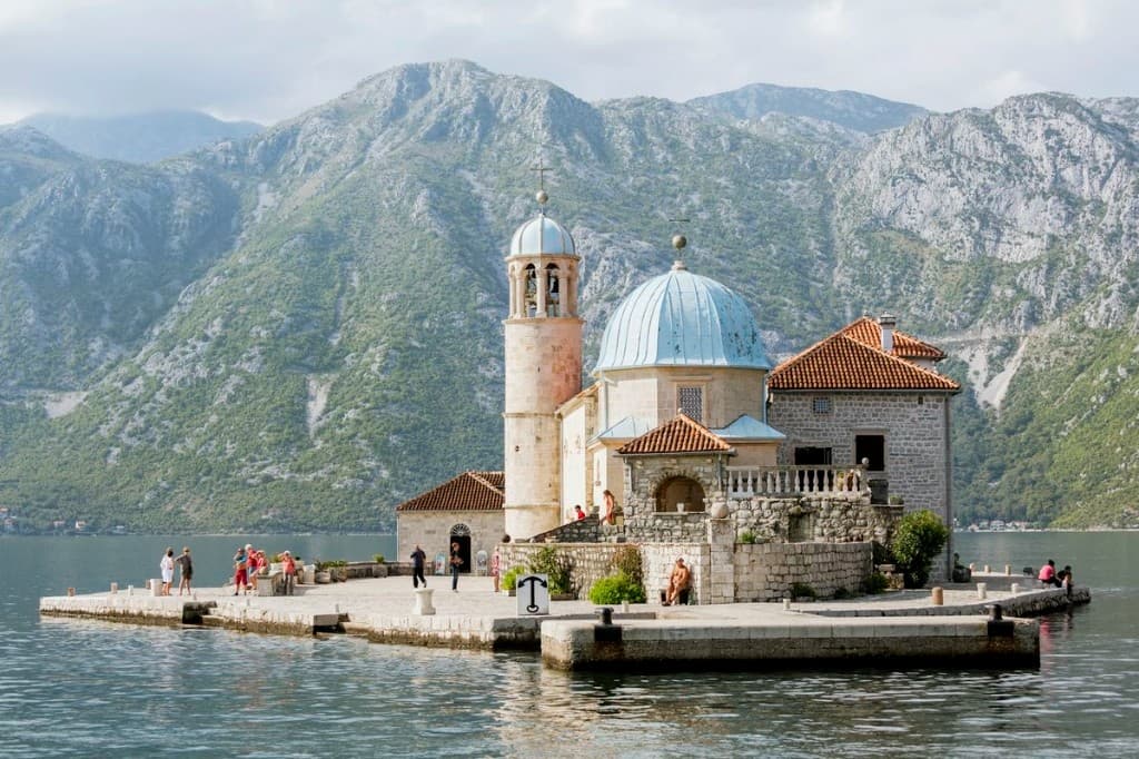 Fortified islet on the Budva Riviera—red roofs above turquoise water, one of the Adriatic’s iconic views.